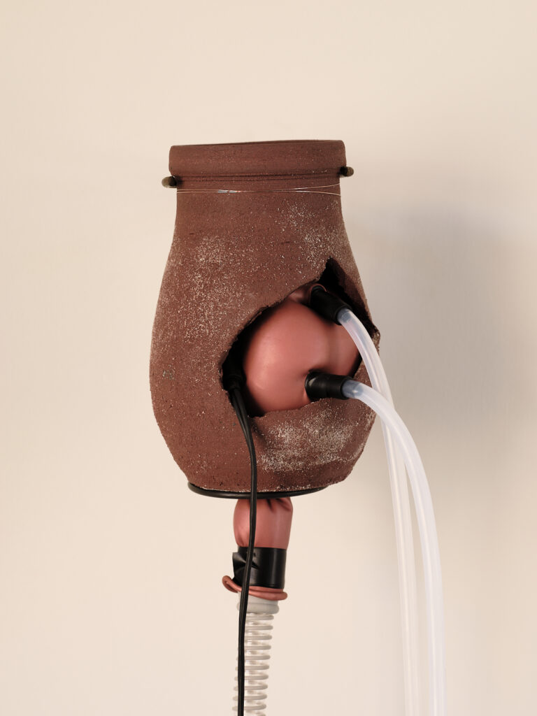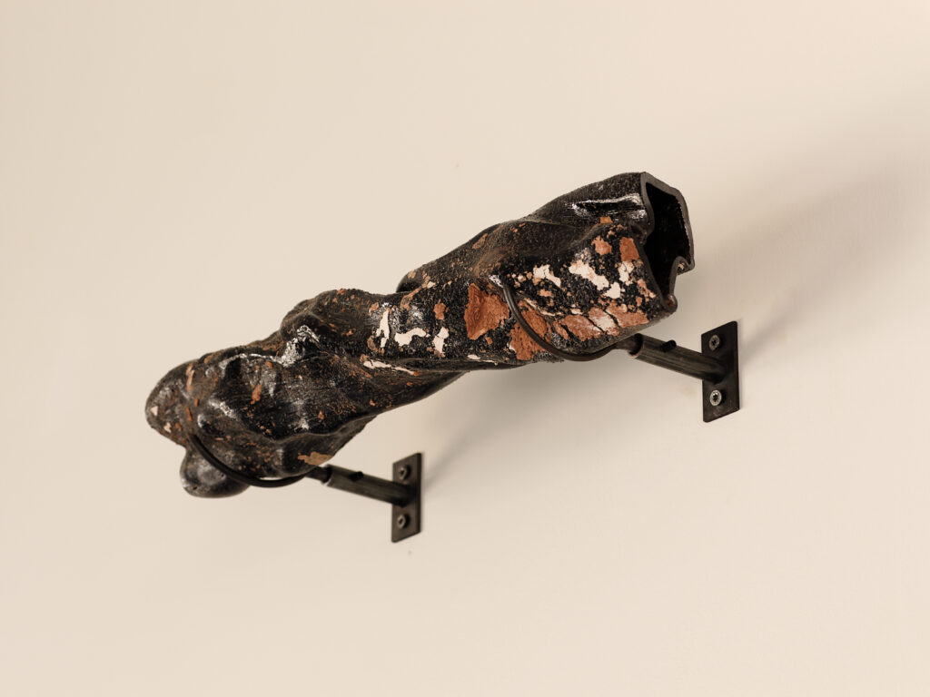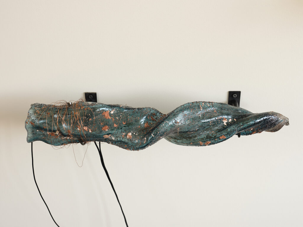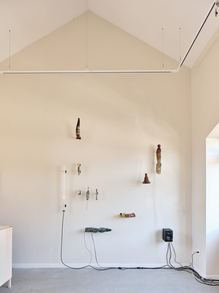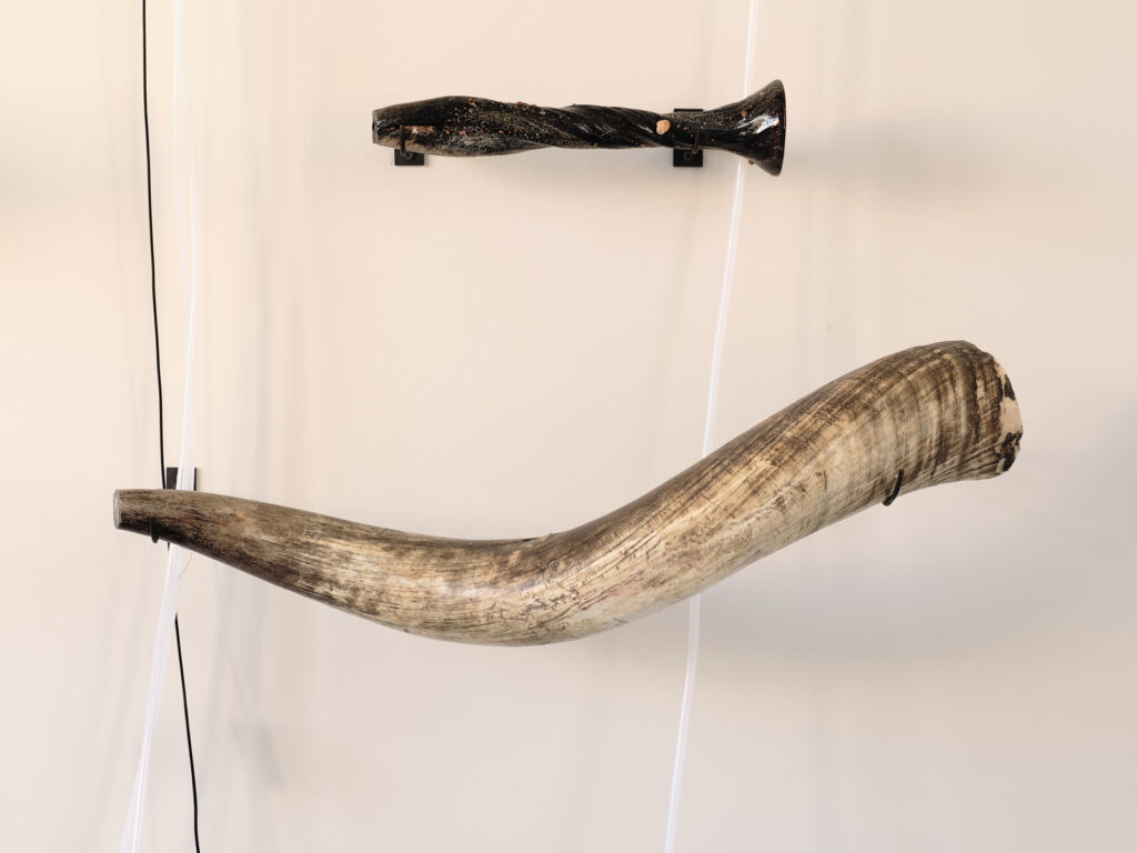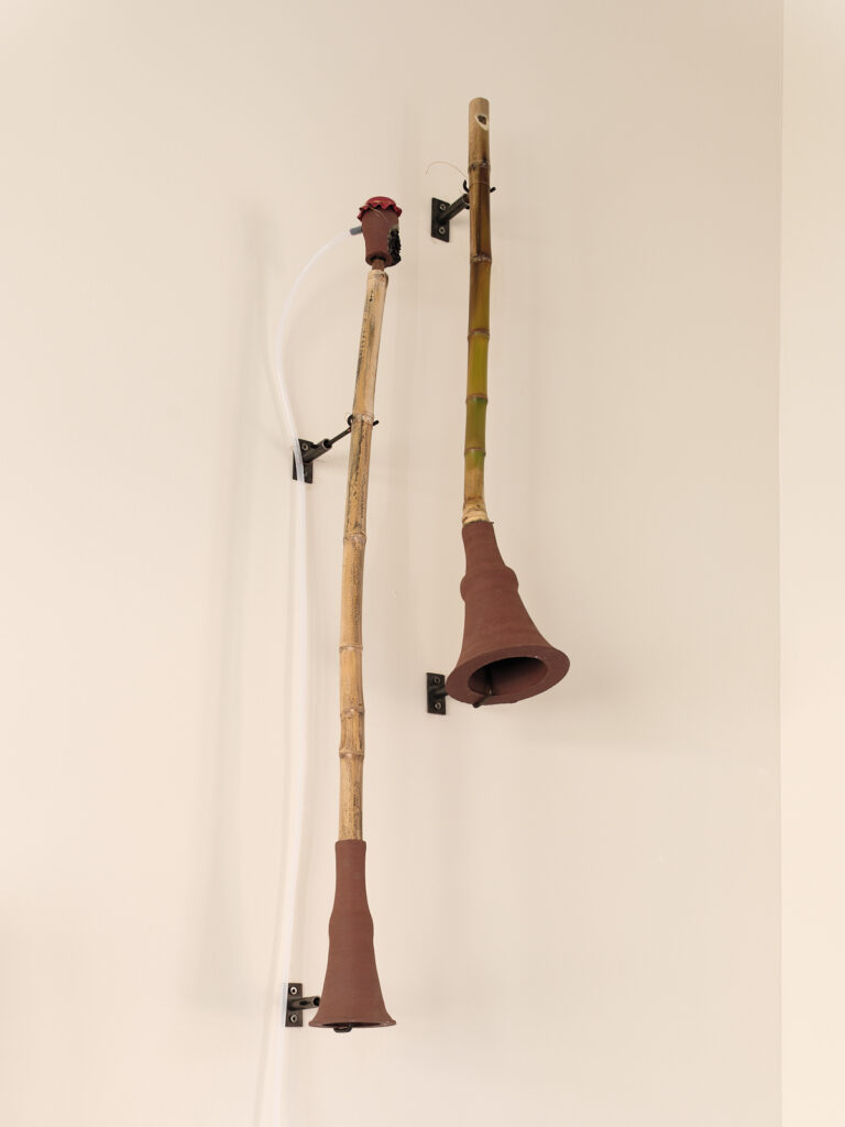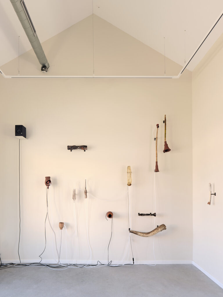 The exhibition’s layout presents this formal exploration in the style of an archaeological museum, while bringing its acoustic dimension to life. Connected by a network of tubes and cables, these wind instruments engage in a polyphonic dialogue composed by the artist. Meanwhile, other pieces remain silent, retaining only the suggestion of their sonic potential.