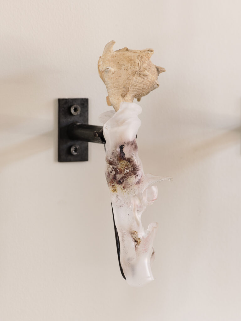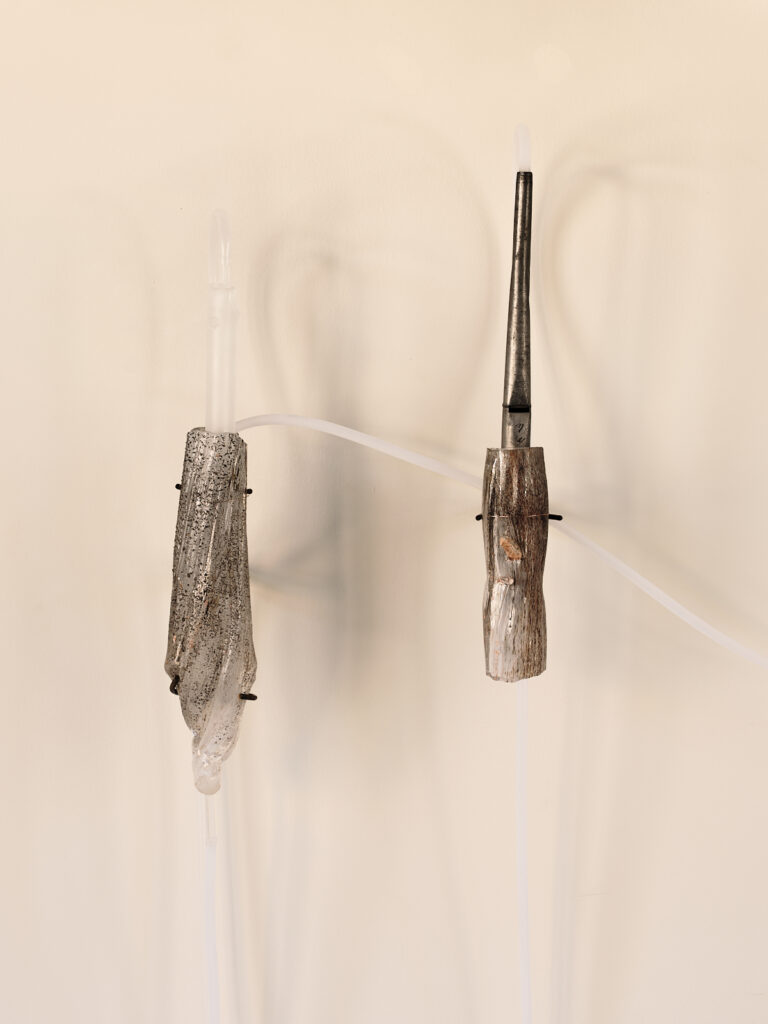 This story of breath echoes the technique of glassblowing: the thermoacoustic phenomenon arose from an observation by glassblowers who perceived sounds emerging from their rods. Alan Affichard thus shapes fragments of glass into tubular forms—inflated, swollen, or even altered by oxides. Air rushes into these volumes, collides with their rough surfaces, and generates a variety of notes. These experiments draw on various glassworking techniques: blowing to stretch and twist the material; working with a torch to create fine, precise mouthpieces from tubes; and crafting a mold to blow the glass into a constrained, puffed-up shape.